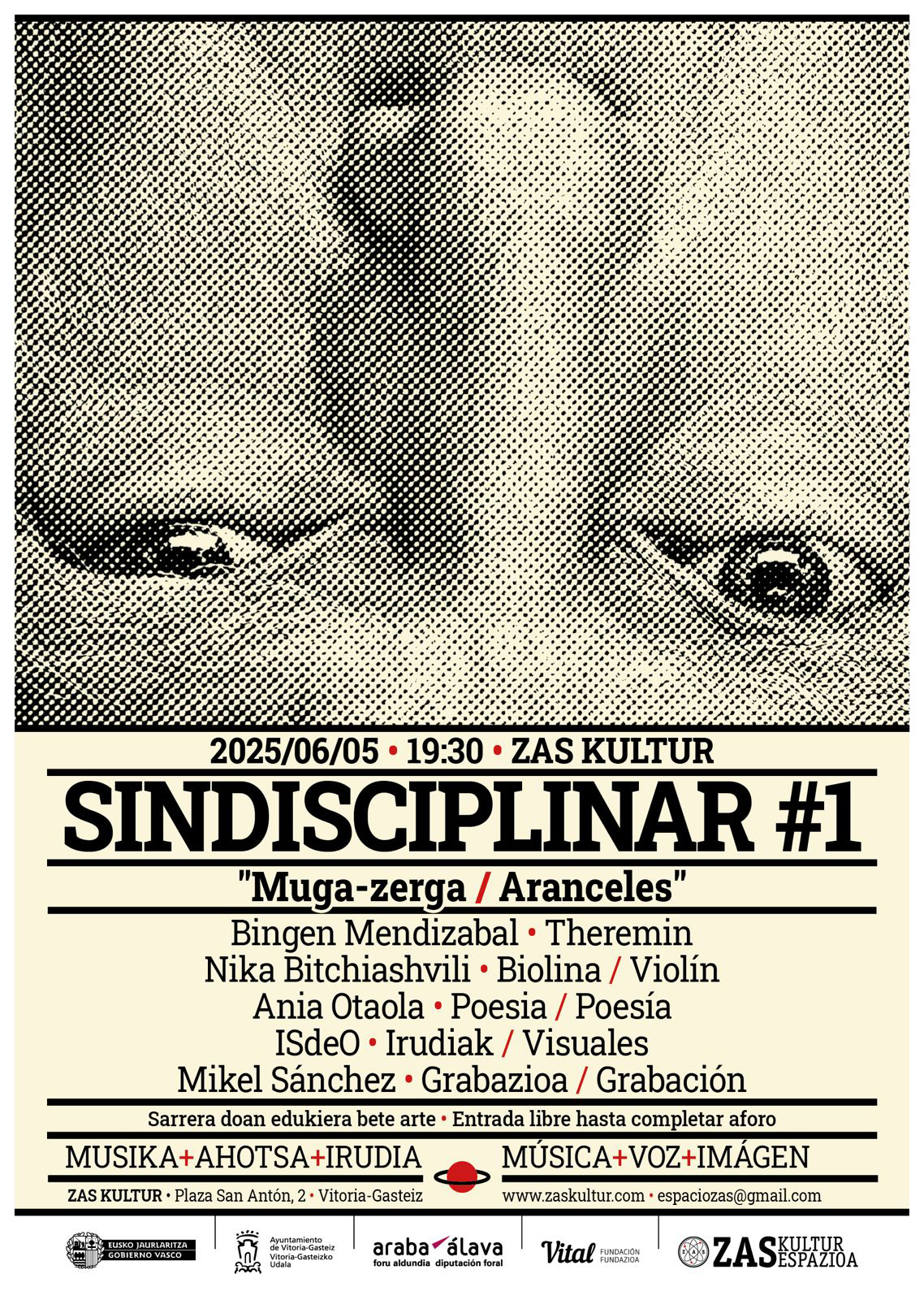 Aranceles plantea cruzar esas fronteras formales, dejar que los lenguajes dialoguen desde la escucha y la improvisación. Sin estructura cerrada. Sin mapas previos. Participan Ibón Sáenz de Olazagoitia (proyección de imágenes), Bingen Mendizabal (theremín), Nika Bitchiashvili (violín) y Ania Otaola (poesía). La actividad ha sido grabada por el realizador Mikel Sánchez. Y la coordinación, a cargo del artista y gestor Iñaki Larrimbe.